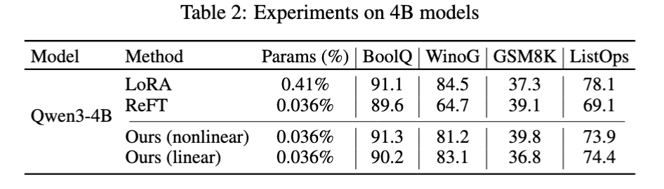 What is surprising about these results is that linear steering is performing better than non-linear steering. Non-linear steering is not necessarily more expressive than linear steering (with the same rank), and for these tasks, it seems to be that the steering really is linear-like, validating the choice in ReFT. In this situation, it would be better to let the steering have more rank as a pure linear model rather than with some non-linearity messing with this structure.